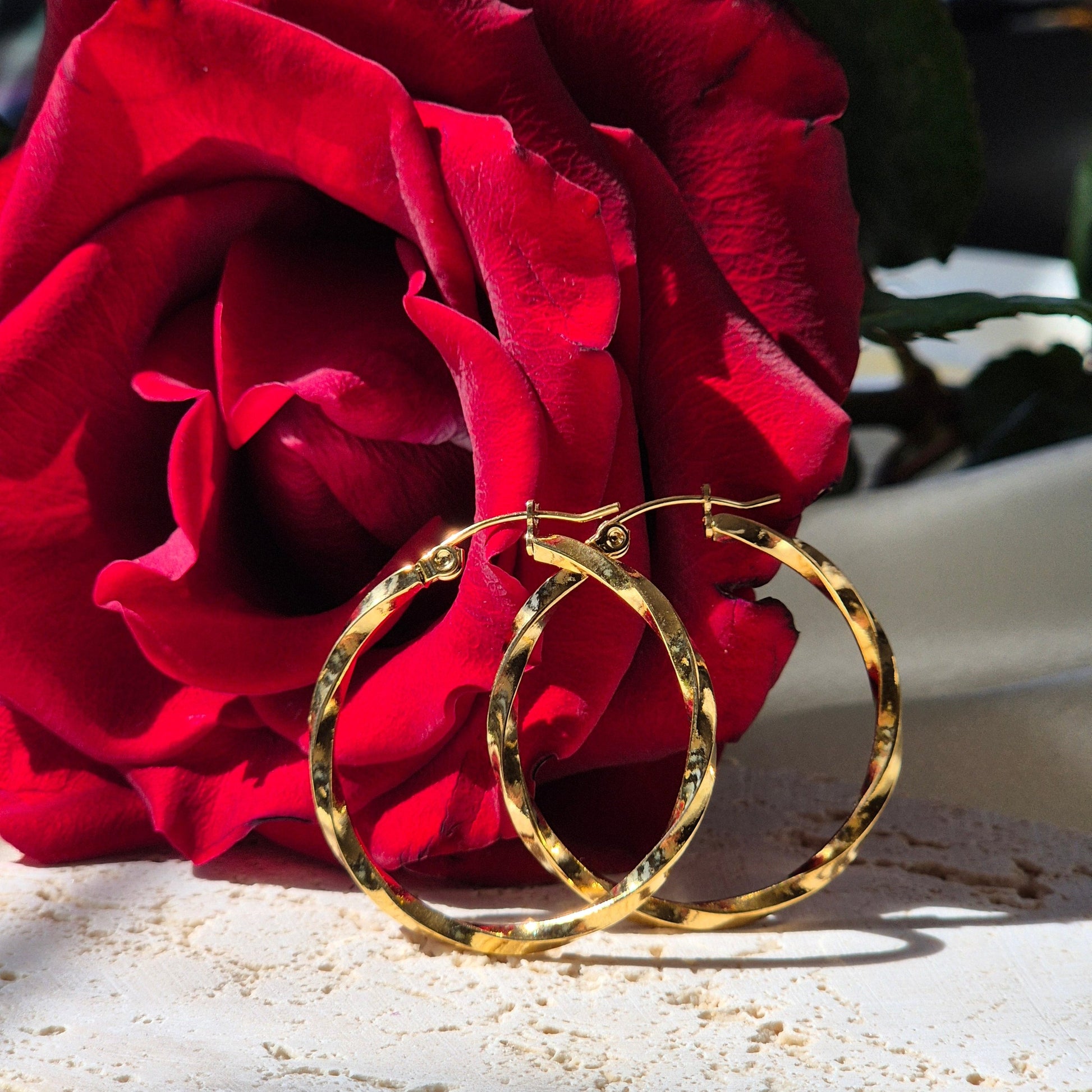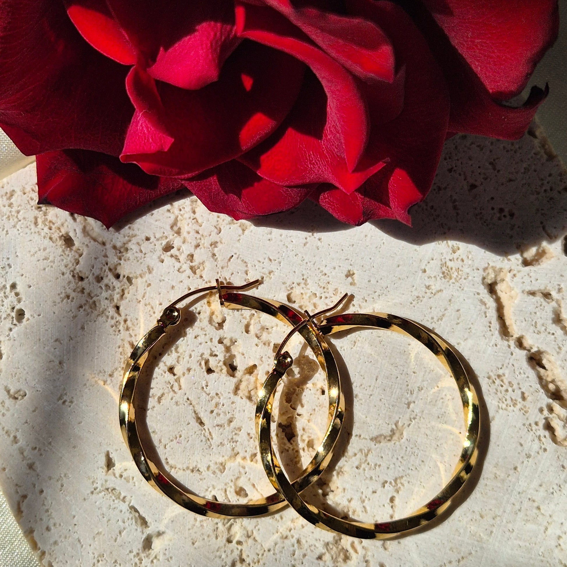 Elara ~ A celestial wonder orbiting Jupiter. Meticulously handcrafted, the Elara Hoop Earrings are beautifully twisted. These earring in Gold boast a luxurious 18K gold plating for a timeless and sophisticated look.